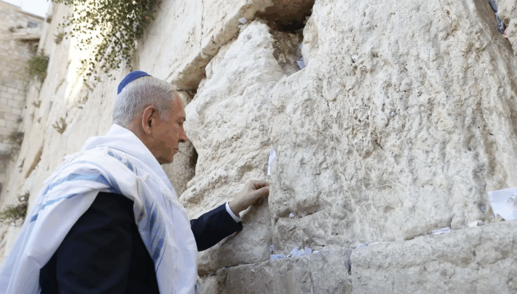 وفي مشهد لافت ذي دلالات دينية، صُوّر رئيس الوزراء الإسرائيلي بنيامين نتنياهو وهو يضع ورقة كتبها بخط اليد داخل شق في الحائط الغربي (المبكى)، أكثر المواقع قداسة في العقيدة اليهودية. ونشر مكتبه صورة للورقة التي كُتب عليها: