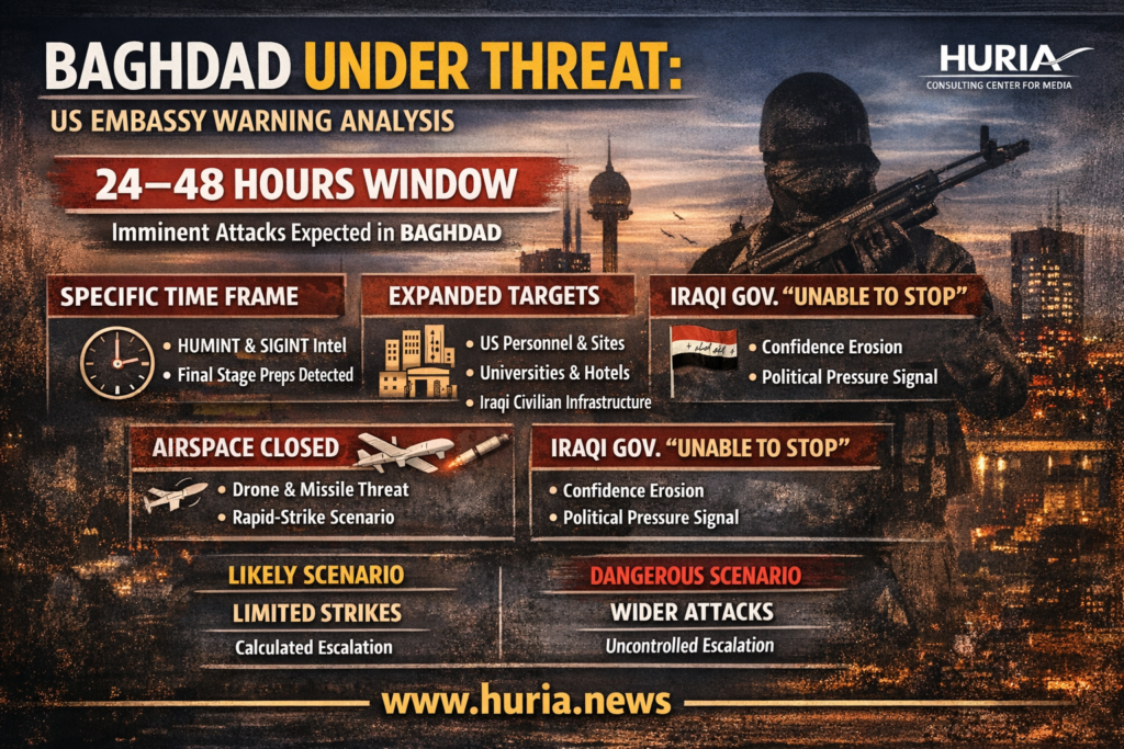 التحذير الأمريكي يمثل مؤشرًا واضحًا على انتقال التهديد من مرحلة التقدير إلى مرحلة الاحتمال القريب. ورغم أن السيناريو المرجح يبقى ضمن إطار التصعيد المحسوب، إلا أن طبيعة الأهداف المحتملة واتساع نطاقها يضع العراق أمام اختبار أمني وسياسي معقد.