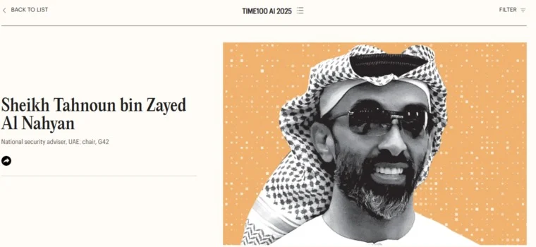 أدرجت مجلة تايم الأمريكية الشيخ طحنون بن زايد آل نهيان، نائب حاكم إمارة أبوظبي، مستشار الأمن الوطني بدولة الإمارات، ورئيس مجلس إدارة مجموعة G42، ضمن قائمتها السنوية لأكثر 100 شخصية تأثيرًا في مجال الذكاء الاصطناعي لعام 2025.
