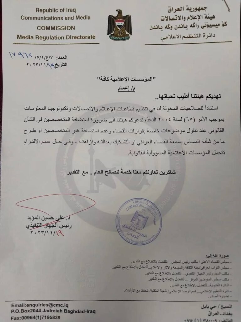 دعت هيئة الاعلام والاتصالات المؤسسات الاعلامية لاستضافة المتخصصين بالشأن القانوني حصراً لعدم المساس بالقضاء.
