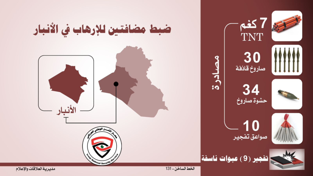 إستناداً إلى معلومات إستخبارية دقيقة شرعت قوة من جهاز الأمن الوطني في شمالِ بغداد وبعد استحصال الموافقات القضائية بواجب لمتابعة هدف إستخباري في محافظة الأنبار تمكنت خلاله من العثور على مخلفات حربية لعصابات د1عش الإرهابية، حيث تمكنت القوة من العثور على (٩) عبوات ناسفة على شكل صفيحة معدنية محلية الصنع في قضاء الكرمة، ليتم تفجيرها موقعياً من قبل الجهد الهندسي دون أي حادث يذكر.