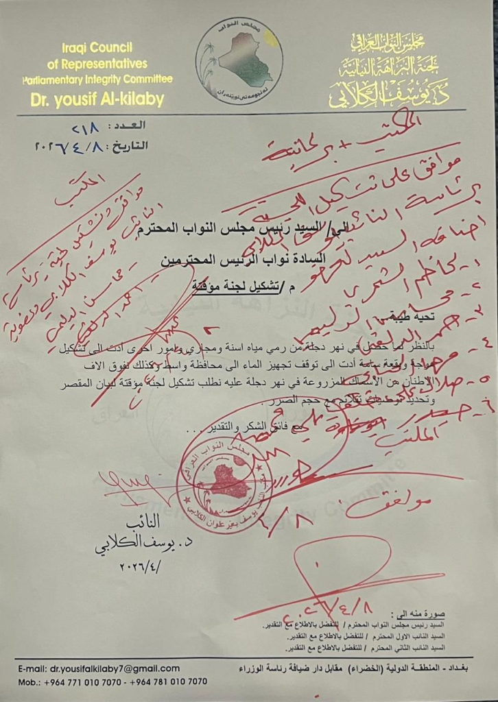 أعلن مجلس النواب العراقي، اليوم، عن تشكيل لجنة نيابية خاصة لمتابعة ملف تلوث مياه نهر دجلة، برئاسة النائب يوسف الكلابي، في خطوة تهدف إلى معالجة واحدة من أخطر التحديات البيئية التي تهدد الصحة العامة والأمن المائي في البلاد.