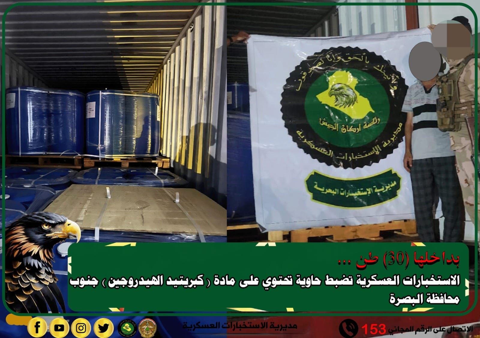 ضبطت مديرية الاستخبارات العسكرية حاوية تحتوي على مادة (كبريتيد الهيدروجين ) جنوب محافظة البصرة.