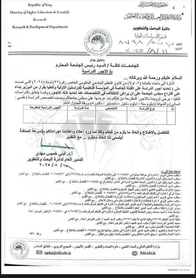 أعلنت وزارة التعليم العالي والبحث العلمي، اليوم الأربعاء (13 آب 2025)، منح الجامعات صلاحية بتخفيض الأجور للدراسات العليا مع مراعاة التخصص.