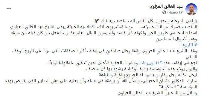 وتابع، “واليوم يودّع هذه المؤسسة بشرف وكرامة يشهد بها كل منصف. ليحل مكانه رجل وفارس يشهد له الجميع بالقوة والنزاهة. مبارك لعثمان الجحيشي، واسأل الله أن يوفقه في عمله وأن يعينه على عش الدبابير الذي يتربص بهذه المؤسسة “المنكوبة”، رسائل من المحبين للشيخ عبد الخالق العزاوي”.