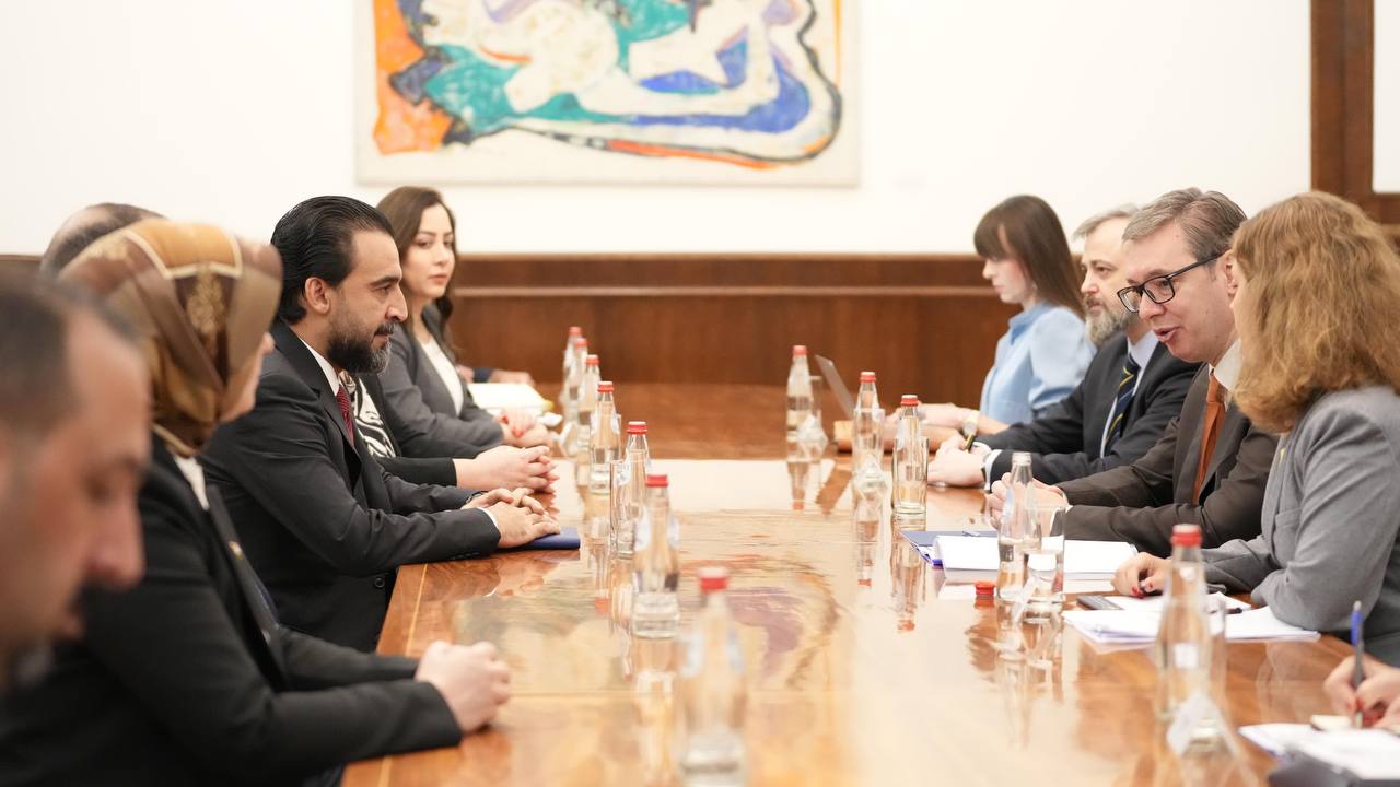 وقال المكتب الإعلامي لرئيس البرلمان في بيان، إن “الرئيس الحلبوسي التقى رئيسَ جمهورية صربيا الكساندر فوجيج، وجرى، خلال اللقاء، بحث العلاقات الثنائية بين البلدين، وتطوير التعاون في عدد من المجالات منها التعليم والزراعة والصحة، فضلاً عن التعاون على المستوى البرلماني وتفعيل لجان الصداقة وتبادل الخبرات”.