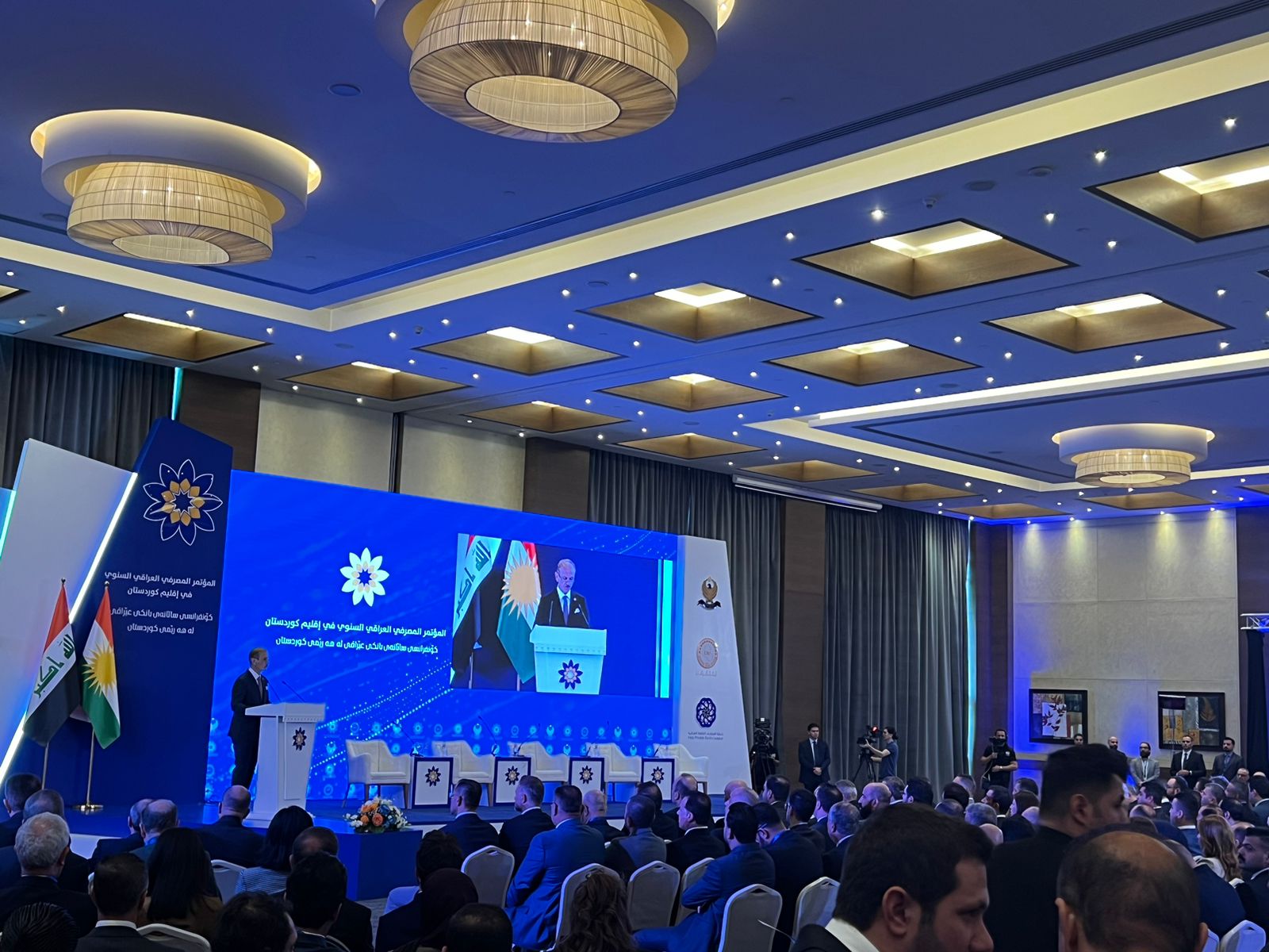 وقال الحنظل في كلمته: “يسعدني أن أرحب بكم بأجمل ترحيب من أربيل عاصمة إقليم كردستان، وأن أنقل لكم تحياتي، إخوتي وزملائي رؤساء مجالس الإدارة في المصارف الخاصة والمدراء المفوضون والإدارة التنفيذية في رابطة المصارف الخاصة العراقية( المؤتمر المصرفي العراقي في إقليم كردستان) برعاية كريمة من رئيس حكومة الإقليم مسرور برزاني، وأعلن افتتاح المؤتمر لأعماله في 21/10/2023”.