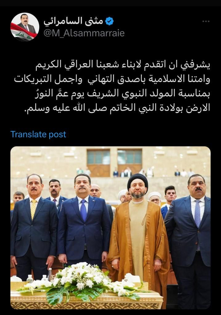 وقال السامرائي في منشور على منصة “أكس” ، انه “يشرفني ان أتقدم لابناء شعبنا العراقي الكريم وامتنا الإسلامية باصدق التهاني واجمل التبريكات بمناسبة المولد النبوي الشريف”.