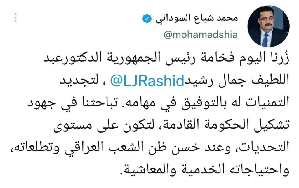 رئيس الوزراء المكلف محمد شياع السوداني , الحكومة المقبلة ستكون على مستوى التحديات وعند حُسن ظن الشعب العراقي وتطلعاته واحتياجاته الخدمية والمعاشية.