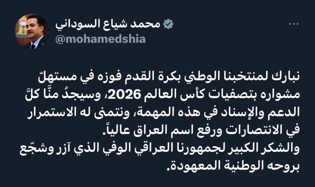 السوداني يهنئ المنتخب العراقي بعد فوزه بالتصفيات المزدوجة على اندونيسيا