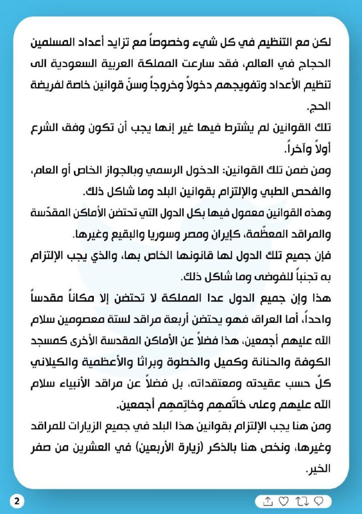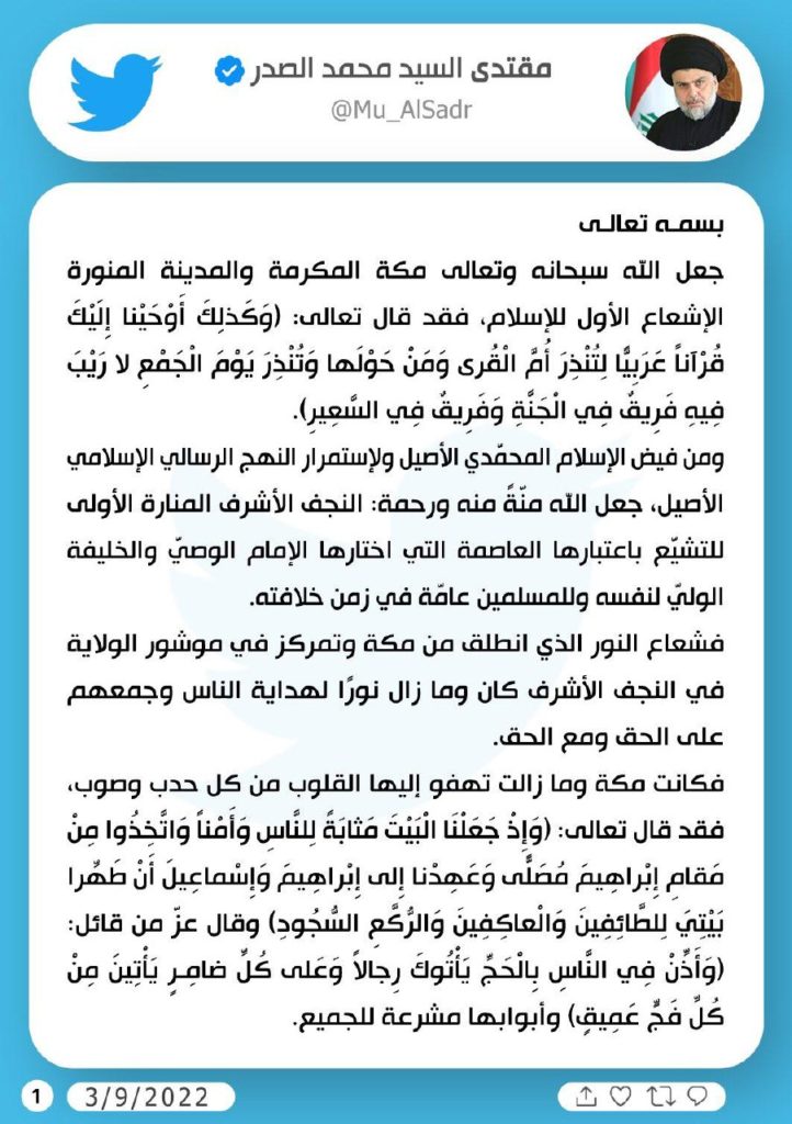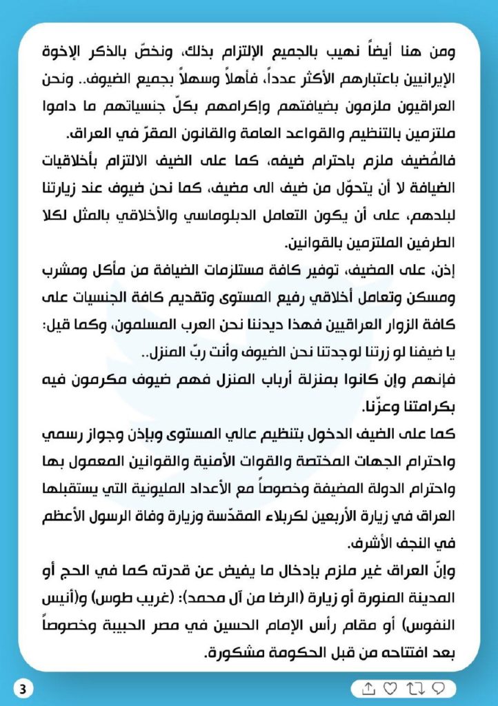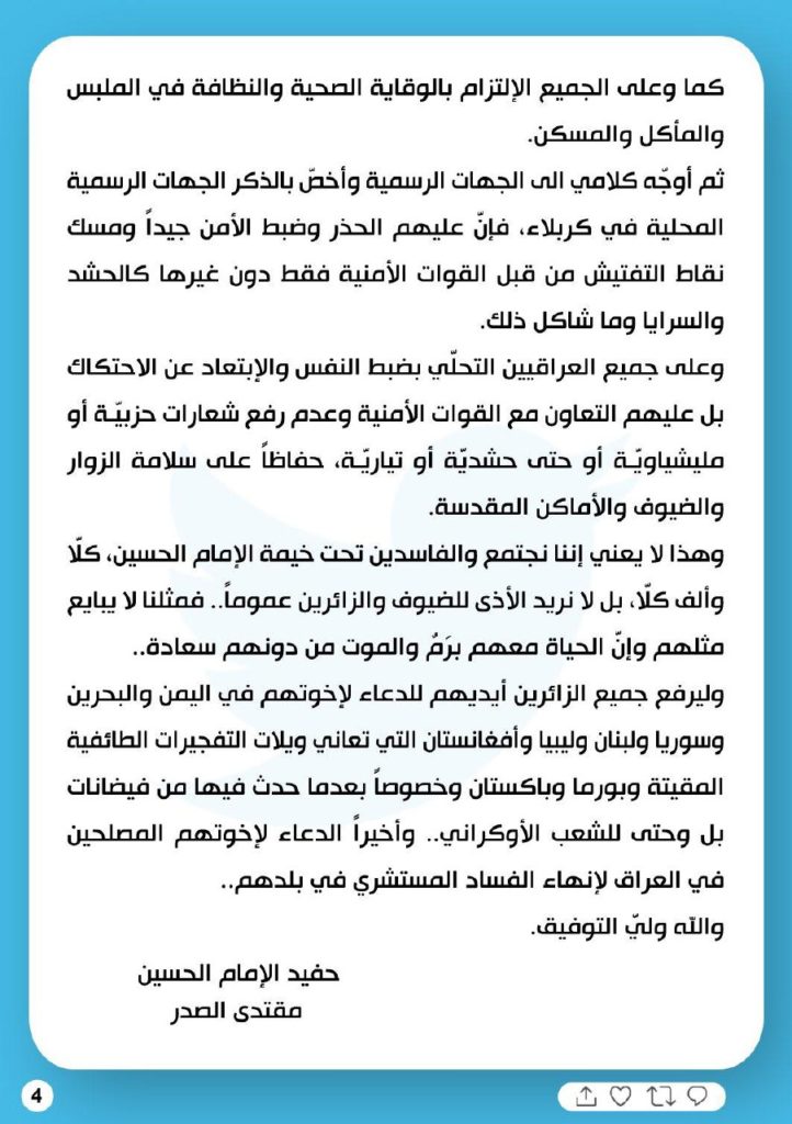 الصدر .. العراق غير ملزم بإدخال ما يفيض عن قدرته كما في الحج أو المدينة المنورة أو زيارة (الرضا من آل محمد)
