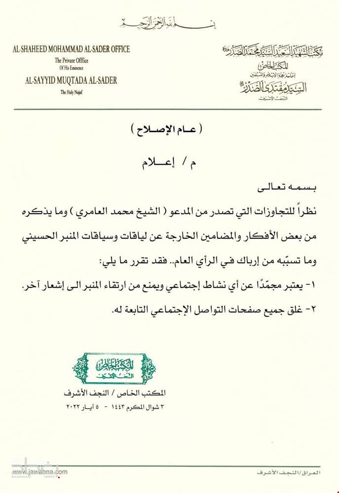 اعلن مكتب زعيم التيار الصدري مقتدى الصدر، اليوم الخميس، عن تجميد احد اتباع التيار على خلفية تجاوزات صدرت عنه.