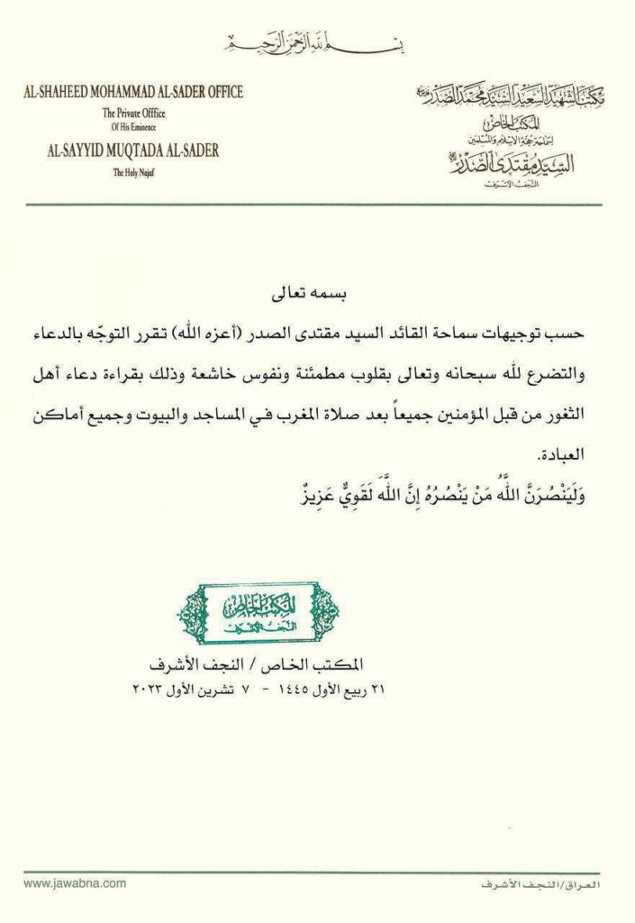 وقال بيان لمكتبه الخاص “: حسب توجيهات سماحة القائد السيد مقتدى الصدر (أعزه الله) تـقرر التوجّه بالدعاء والتضرع لله سبحانه وتعالى بقلوب مطمئنة ونفوس خاشعة وذلك بقراءة دعاء أهل الثغور من قبل المؤمنين جميعاً بعد صلاة المغرب فـي المساجد والبيوت وجميع أماكن العبادة. وَلَيَنْصُرَنَّ اللّـهُ مَنْ يَنْصُرُهُ إِنَّ اللّـهَ لَقَوِيٌّ عَزِيزٌ.