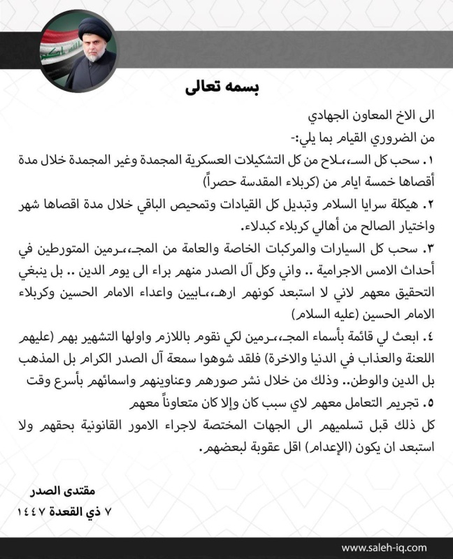 أصدر زعيم التيار الوطني الشيعي مقتدى الصدر، السبت، توجيهات جديدة تتعلق بتنظيم العمل العسكري في محافظة كربلاء، شملت إجراءات تتعلق بسحب السلاح وإعادة هيكلة التشكيلات العسكرية.