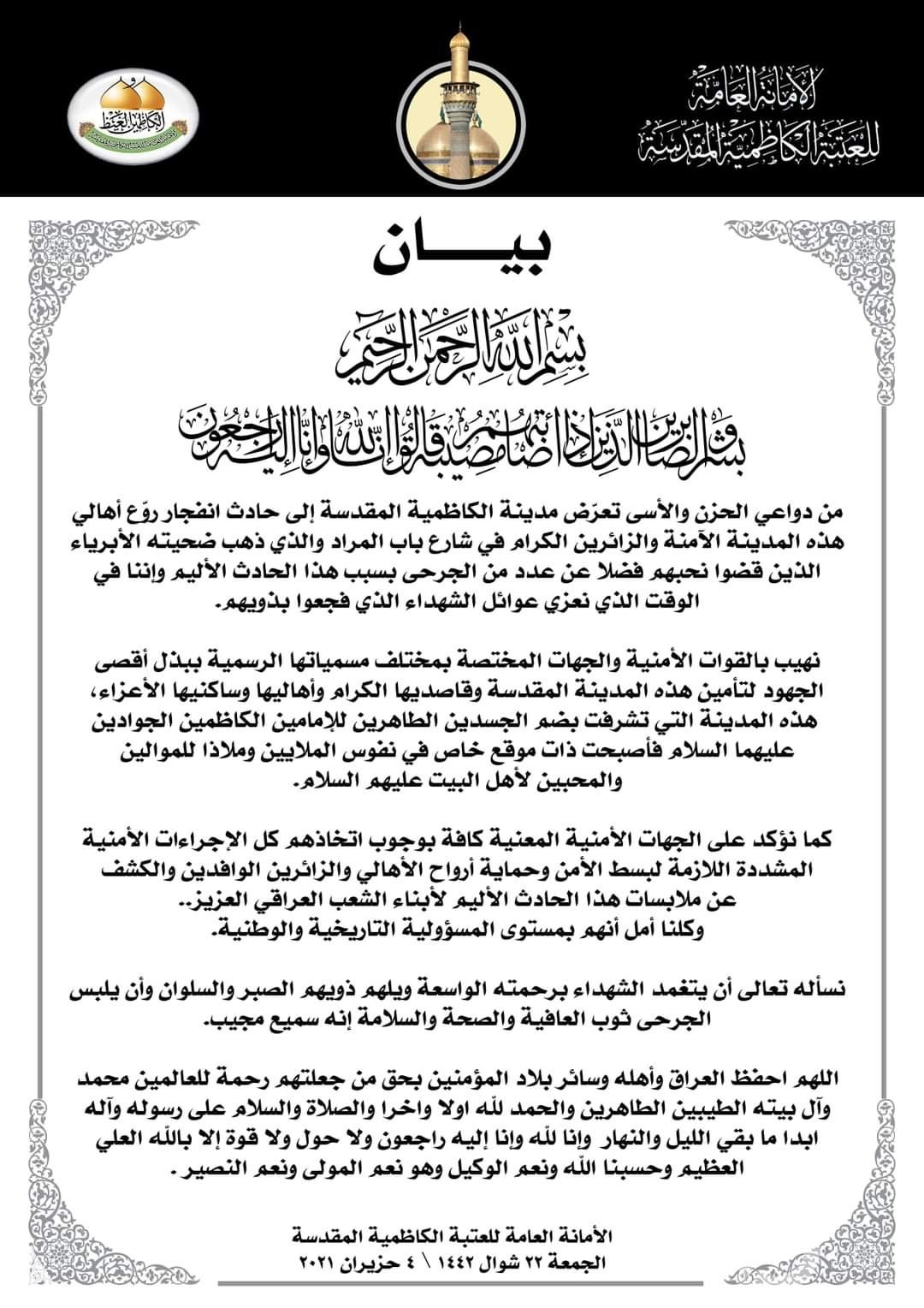 وذكر اعلام العتبة في بيان ان “من دواعي الحزن والأسى تعرّض مدينة الكاظمية المقدسة إلى حادث انفجار روّع أهالي هذه المدينة الآمنة والزائرين الكرام في شارع باب المراد والذي ذهب ضحيته الأبرياء الذين قضوا نحبهم فضلا عن عدد من الجرحى بسبب هذا الحادث الأليم وإننا في الوقت الذي نعزي عوائل الشهداء الذي فجعوا بذويهم”.