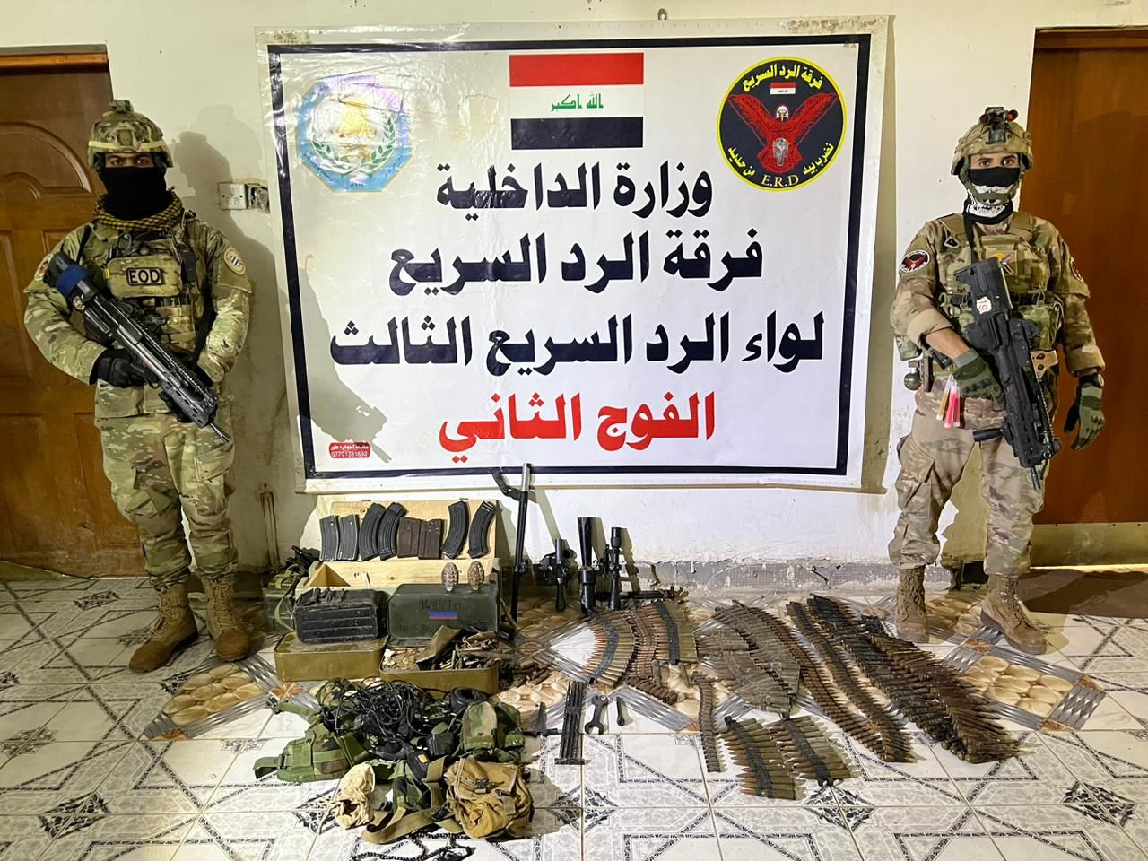 بحسب توجيهات القائد العام للقوات المسلحة، وبأشراف مباشر من قيادة العمليات المشتركة ، تمكنت قوه من الفوج الثاني اللواء الثالث التابع الى قيادة فرقة الرد السريع في وزارة الداخلية وبالتعاون مع قسم استخبارات الفرقة ، من العثور على اسلحة مختلفة خلال تفتيش احد منازل المطلوبين للقضاء وفق احكام المادة 421 من قانون العقوبات الخاصة بالخطف في قضاء بعقوبة بمحافظة ديالى ، حيث تم ضبط ( مخازن كلاشنكوف عدد ٤ ، مخزن قناص عدد٢ ، مخزن M16 عدد١ ، ناضور قناص عدد ٢ مع مانع وميض احادية ، سبطانة BKC عدد واحد ، رمانة هجومي عدد ٢ ، ١١٨ اطلاقة “ففتي كيل” ، ٥٥ اطلاقة احادية حجم ١٢.٥ملم ، حاوية احادية ١٤.٥عدد ٢ ، حاوية BKC عدد واحد ونصف وجهاز لاسلكي .