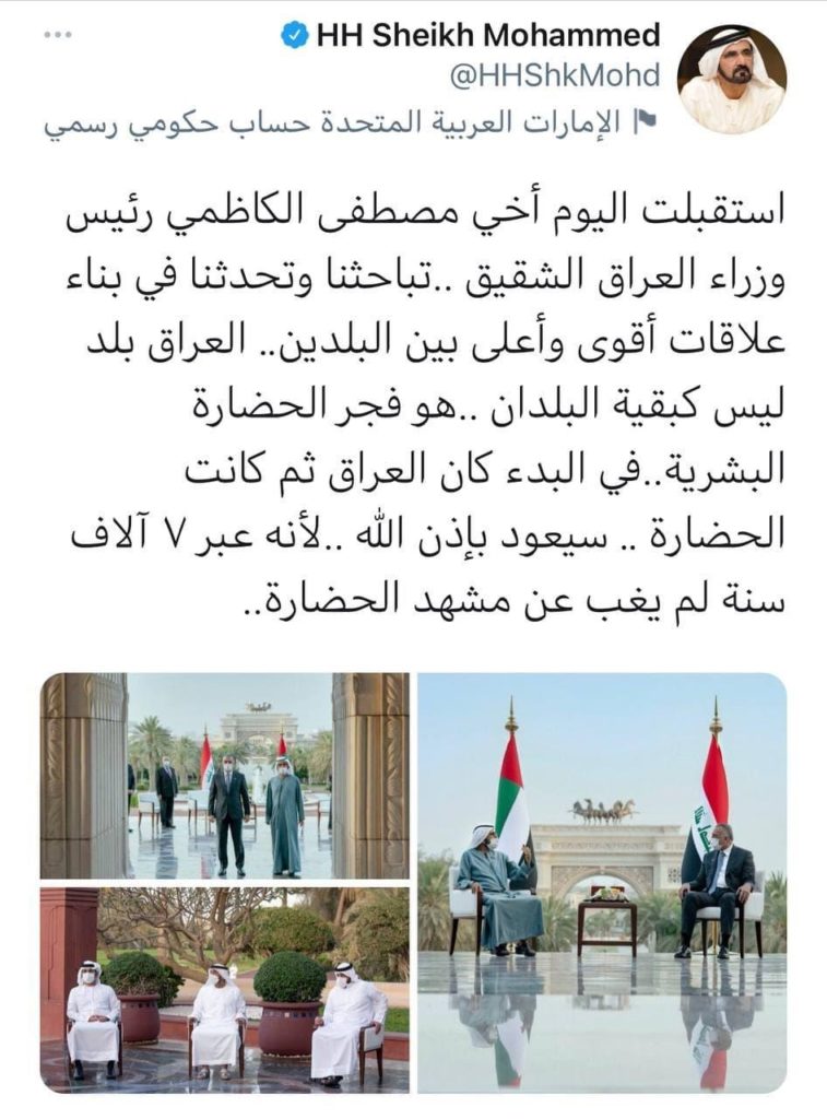 نشر رئيس الوزراء الاماراتي محمد بن راشد آل مكتوم، الاحد، تغريدة بعد لقائه رئيس الوزراء العراقي مصطفى الكاظمي.