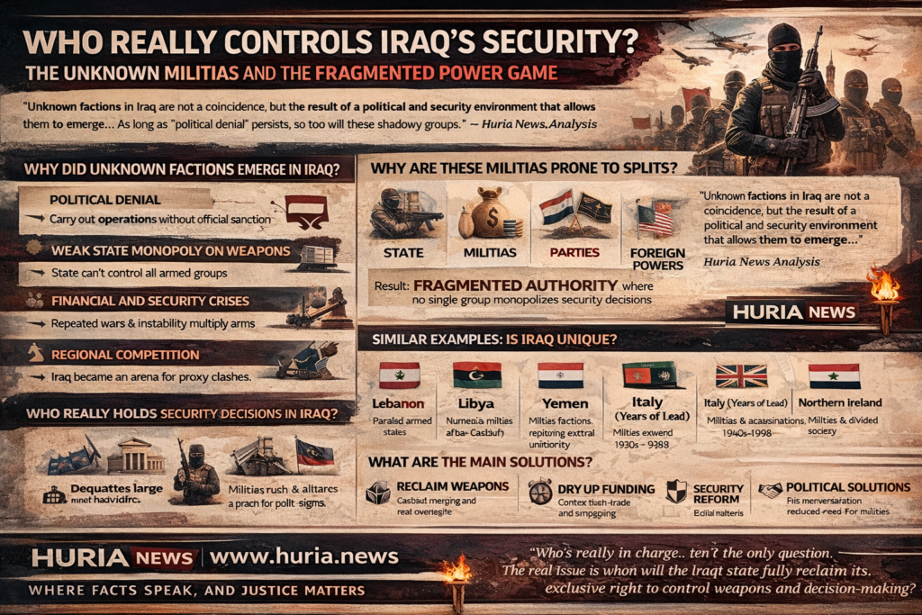 من هنا بدأت تتبلور البيئة التي تسمح بنشوء “الفصيل المجهول” والمقصود هنا ليس بالضرورة جماعة غير موجودة تمامًا، بل في كثير من الأحيان كيان يحمل اسمًا جديدًا، أو واجهة عملياتية مؤقتة، أو مظلة إعلامية فضفاضة، أو مجموعة منشقة عن تنظيم أكبر، أو شبكة محلية تتحرك بغطاء سياسي أو مناطقي أو خارجي من دون أن تعلن صلتها التنظيمية الكاملة و هذا النوع من التكوينات ينمو عادة في الدول التي تتراجع فيها مركزية الدولة، وتصبح الشرعية موزعة بين الحكومة والأحزاب والفاعلين المسلحين والسلطات المحلية وشبكات الاقتصاد السياسي وقد وصفت تشاتام هاوس العراق الحديث بأنه نظام تحوّل إلى “رقعة مركبة” من مؤسسات عامة وخاصة، مع ضبابية بين الرسمي وغير الرسمي، وهو توصيف يفسر كيف يمكن لجهات مسلحة أن تعمل داخل الدولة وحولها وفي بعض الأحيان باسمها أو بمحاذاتها.