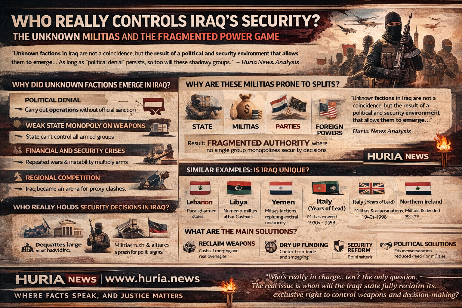 الحل الرابع هو تسوية سياسية داخلية تعيد توزيع الثقة، لا المحاصصة فقط. الفصائل المسلحة تزدهر حين تشعر مكونات أو مناطق أو قوى بأن الدولة ليست ضامنًا عادلًا لها. لذلك فإن استعادة الدولة لا تكون فقط بنزع السلاح، بل بإعادة بناء العقد السياسي: تمثيل حقيقي، عدالة في الموارد، لا مركزية منضبطة، وقضاء يستطيع أن يعمل على الجميع. أيرلندا الشمالية خرجت جزئيًا من دوامة العنف حين ربطت التسوية بين تقاسم السلطة ونزع السلاح والاعتراف المتبادل؛ والعراق يحتاج إلى صيغة خاصة به تضمن أن لا يشعر أي طرف أن بقاءه مشروط ببندقيته الخاصة.
