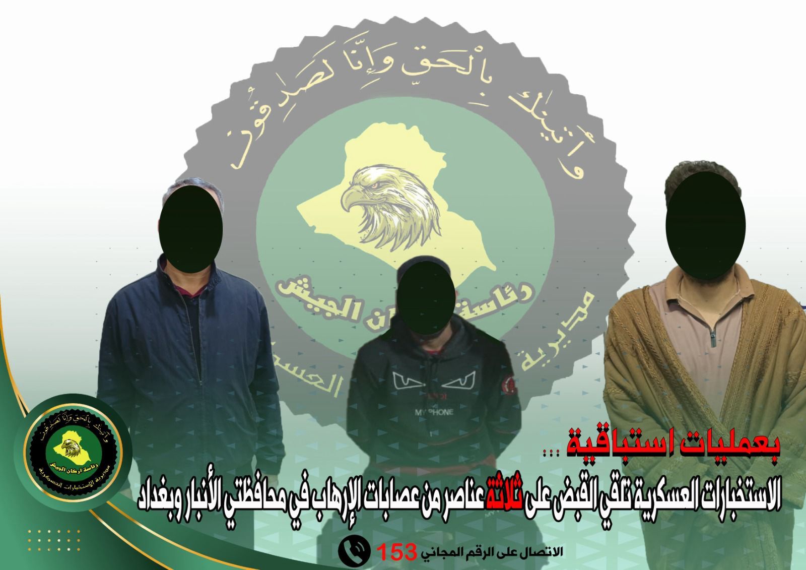 القت الاستخبارات العسكرية القبض على ثلاثة من عناصر داعش الارهابي في بغداد والانبار .