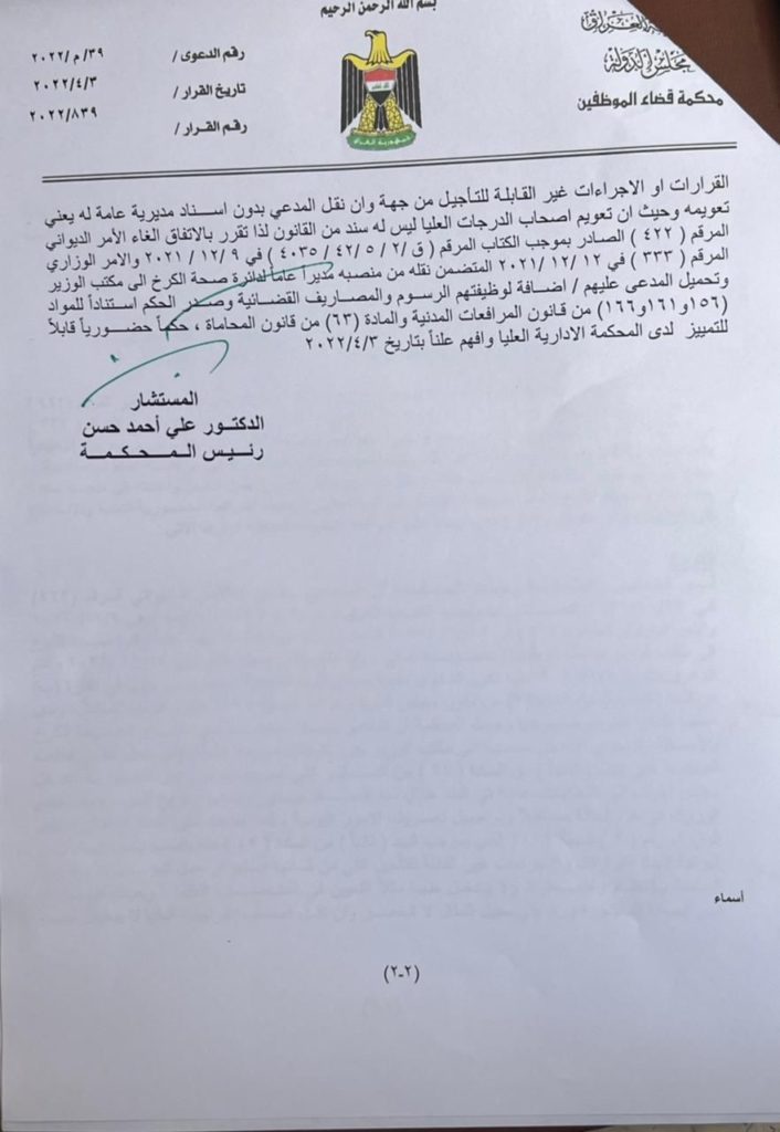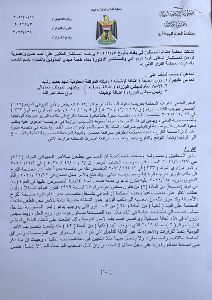 قضت محكمة قضاء الموظفين، يوم الإثنين، بإعادة جاسب الحجامي الى منصبه مديراً لدائرة صحة الكرخ.