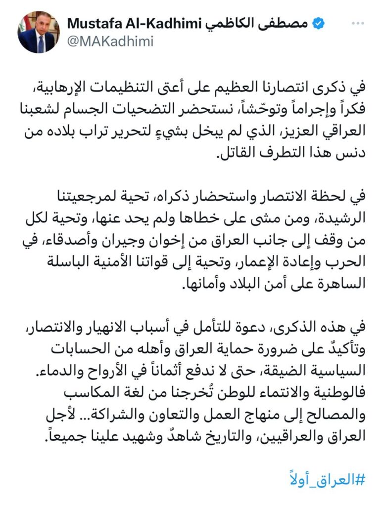 في ذكرى انتصارنا العظيم على أعتى التنظيمات الإرهابية، فكراً وإجراماً وتوحّشاً، نستحضر التضحيات الجسام لشعبنا العراقي العزيز، الذي لم يبخل بشيءٍ لتحرير تراب بلاده من دنس هذا التطرف القاتل.