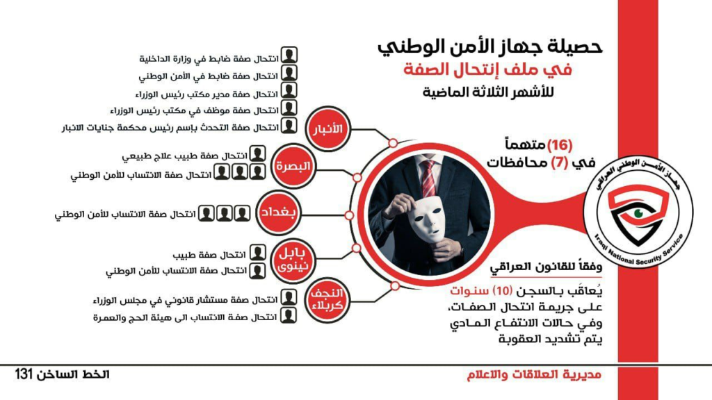 يواصل جهاز الأمن الوطني عملياته النوعية في ملاحقة المجرمين والخارجين عن القانون ومنهم أولئك الذين يمارسون عمليات النصب والإحتيال وإستغلال المواطنين بانتحالهم صفات رسمية متعددة بُغية تحقيق مكاسب مالية غير مشروعة، حيث تمكنت مفارزنا وبعد جهود استخبارية وكمائن محكمة من الإطاحة بـ (١٦) متهماً بانتحال الصفة من أبرزهم منتحل صفة نائب مدير مكتب رئيس الوزراء، وآخر انتحل صفة مستشار قانوني في رئاسة الوزراء.