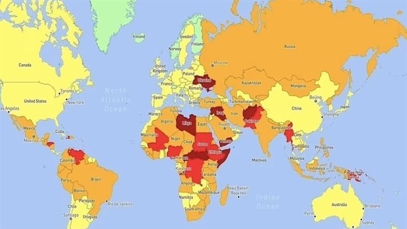 فيما تعد دول مثل: ليبيا وجنوب السودان وسوريا وأوكرانيا والعراق من بين الدول الأكثر خطورة للزيارة، حيث تم تصنيف هذه الدول على أنها ذات مخاطر أمنية شديدة.