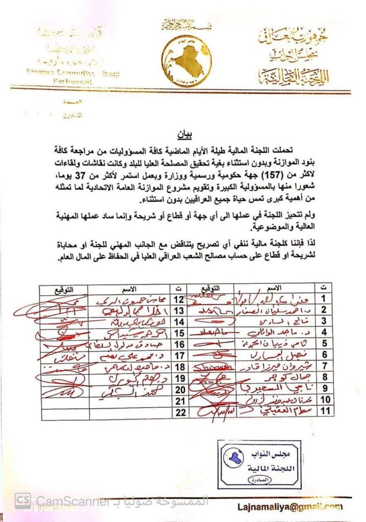 وشددت اللجنة، أنها “لم تتحيز في عملها الى أي جهة أو قطاع أو شريحة وإنما ساد عملها المهنية العالية والموضوعية”، مضيفة “إننا كلجنة مالية ننفي أي تصريح يتناقض مع الجانب المهني للجنة او محاباة الشريحة او قطاع على حساب مصالح الشعب العراقي العليا في الحفاظ على المال العام”.