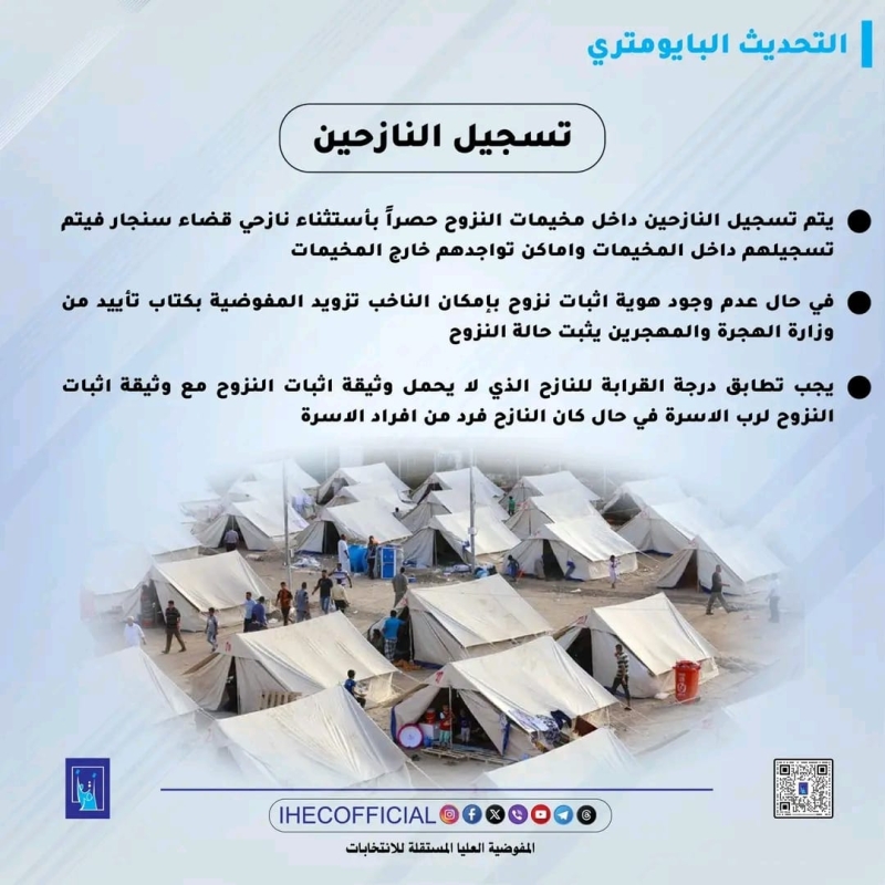 أصدرت المفوضية العليا المستقلة للانتخابات، اليوم الثلاثاء (22 نيسان 2025)، تعليمات جديدة للنازحين فيما يتعلق بالتحديث البايومتري لبطاقاتهم.