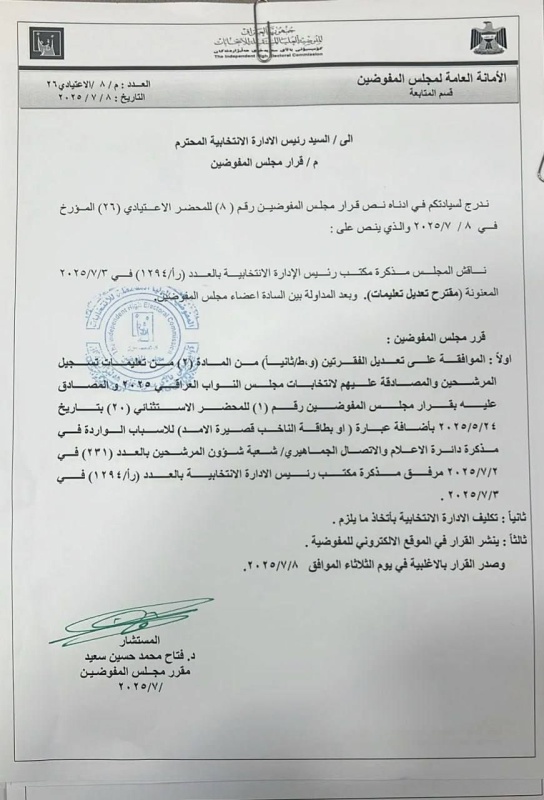 وذكرت المفوضية في بيان، أن “مجلس المفوضين قرر تعديل الفقرتين (4) و(9) من المادة (2) في تعليمات تسجيل المرشحين، بناءً على مقتضيات المصلحة العامة، واستناداً إلى الصلاحيات القانونية المخولة له”.