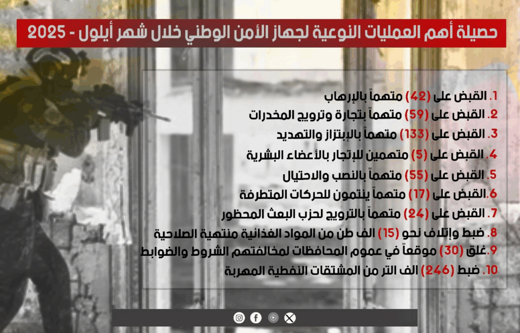 إلى ذلك، أعلن جهاز الأمن الوطني العراقي حصيلة أهم العمليات النوعية التي نفذها خلال شهر أيلول/سبتمبر الماضي.
