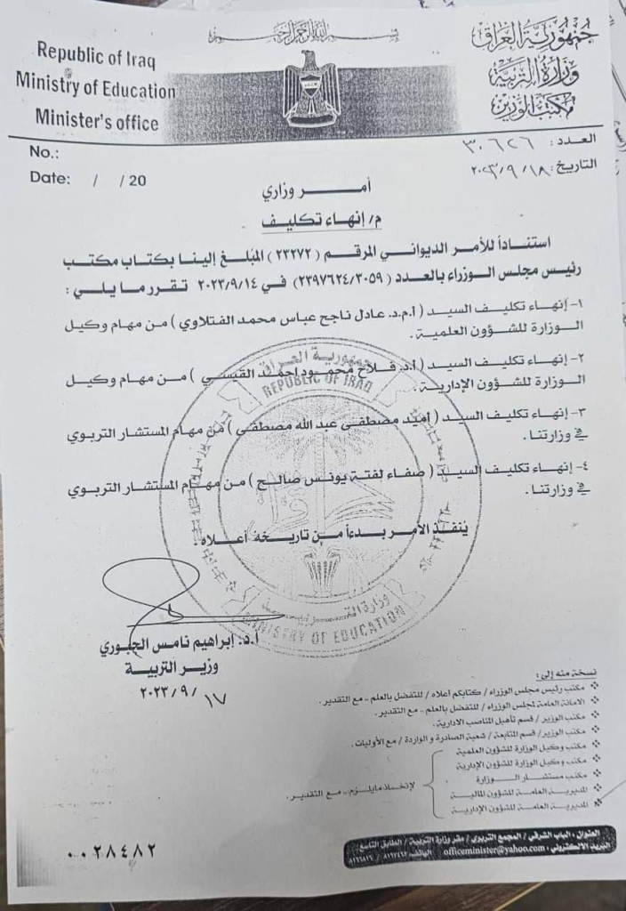 بالوثيقة.. امر وزاري بانهاء تكليف 4 وكلاء ومستشارين