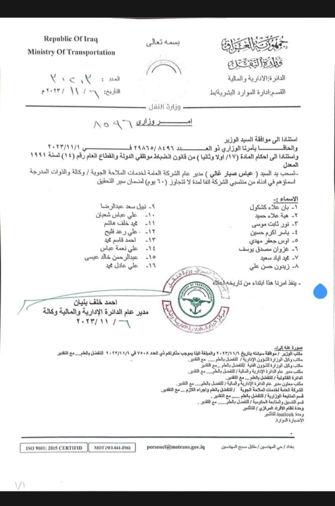 بالوثيقة .. امر وزاري بسحب يد لمدير عام / وكالة