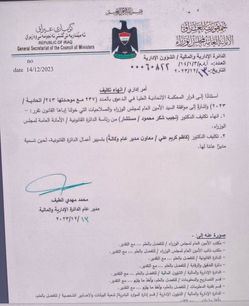 قررت امانة مجلس الوزراء انهاء تكليف المستشار نجيب شكر محمود من رئاسة الدائرة القانونية في الأمانة استنادا لقرار المحكمة الاتحادية.