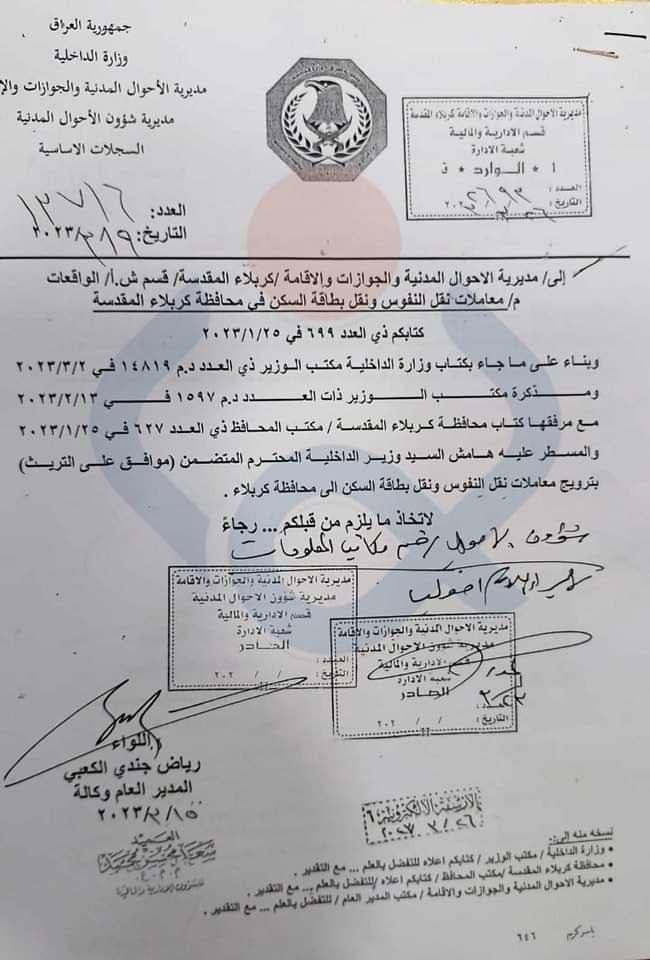 بالوثيقة.. ايقاف نقل النفوس و بطاقة السكن الى كربلاء