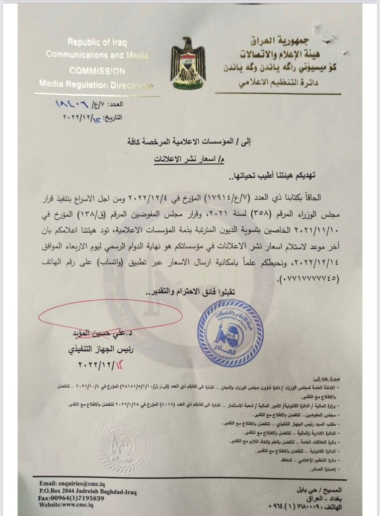 بالوثيقة.. تحديد اخر موعد لأرسال اسعار نشر الاعلانات