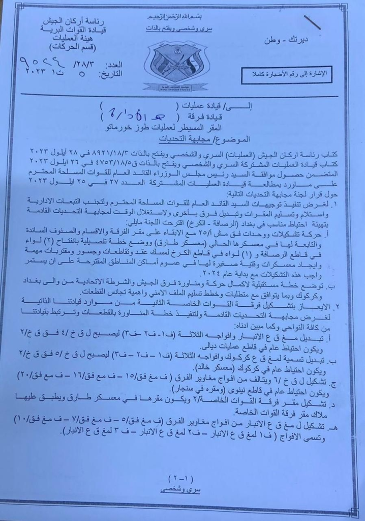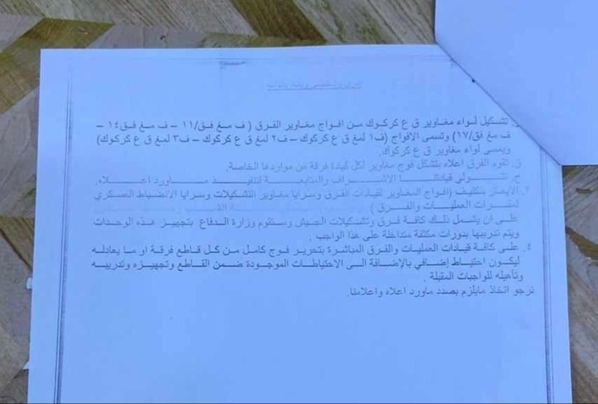 وبحسب الوثيقة انه “تقرر تبديل القطعات العسكرية في 5 محافظات، وانشاء معسكرات في الكرخ والرصافة”.