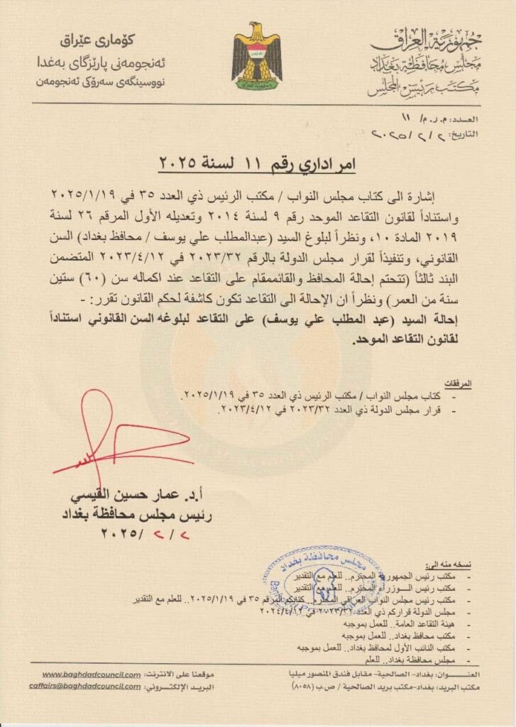 جاء ذلك في كتاب رسمي، صادر عن رئيس مجلس محافظة بغداد، عمار حسين القيسي، حمل عنوان “أمر إداري رقم 11 لسنة 2025”.