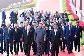 وكان شي صافح كيم وبوتين على هامش العرض العسكري. وتقدّم الثلاثة القادة الدوليين المدعوين لحضور المناسبة. وتحدث الرئيس الصيني إلى ضيفيه أثناء سيرهم معاً على السجادة الحمراء عند ساحة تيان أنمين، حيث مشى بوتين على يمينه وكيم على يساره.