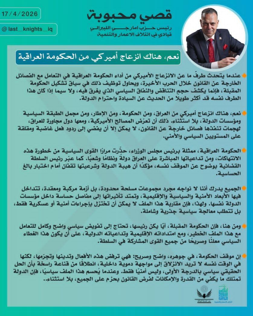 في المقابل، يواجه رئيس الوزراء المنتهيه ولايته محمد شياع السوداني تراجعاً حاداً في فرص التجديد ، وسط ما تصفه مصادر سياسية بـ“رفض أمريكي قاطع”، وهو ما أقر به حليفه قصي محبوبة، الذي أشار إلى أن حكومة السوداني تواجه إشكاليات حقيقية مع واشنطن، ما جعل استمراره خياراً معقداً في هذه المرحلة.