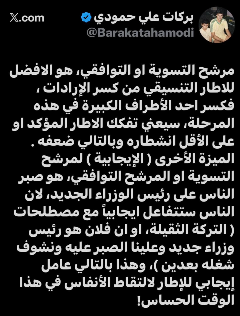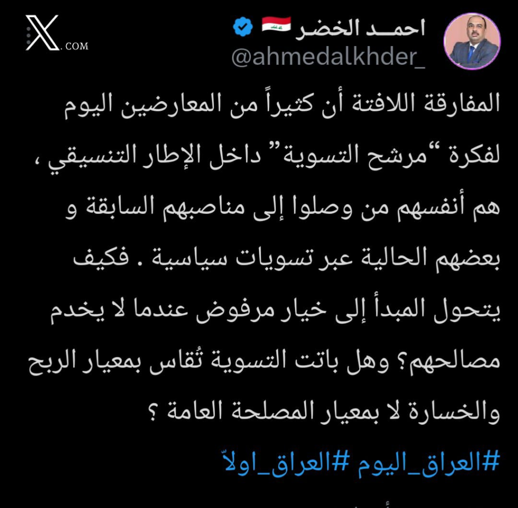 العراق لا يحتاج اليوم إلى مرشح صدام، بل إلى مرشح تسوية يمتلك مواصفات دقيقة: