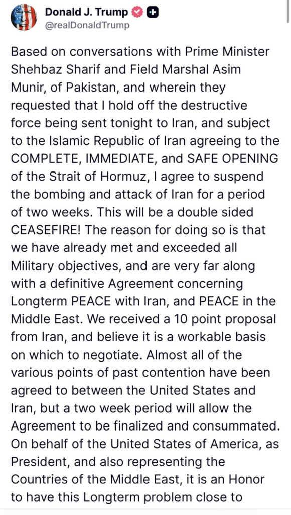 وأشار ترمب إلى أن بلاده تلقت مقترحاً إيرانياً من عشر نقاط، واصفاً إياه بأنه “أساس قابل للتفاوض”، ما يعزز فرص التوصل إلى تسوية خلال فترة الهدنة المعلنة.