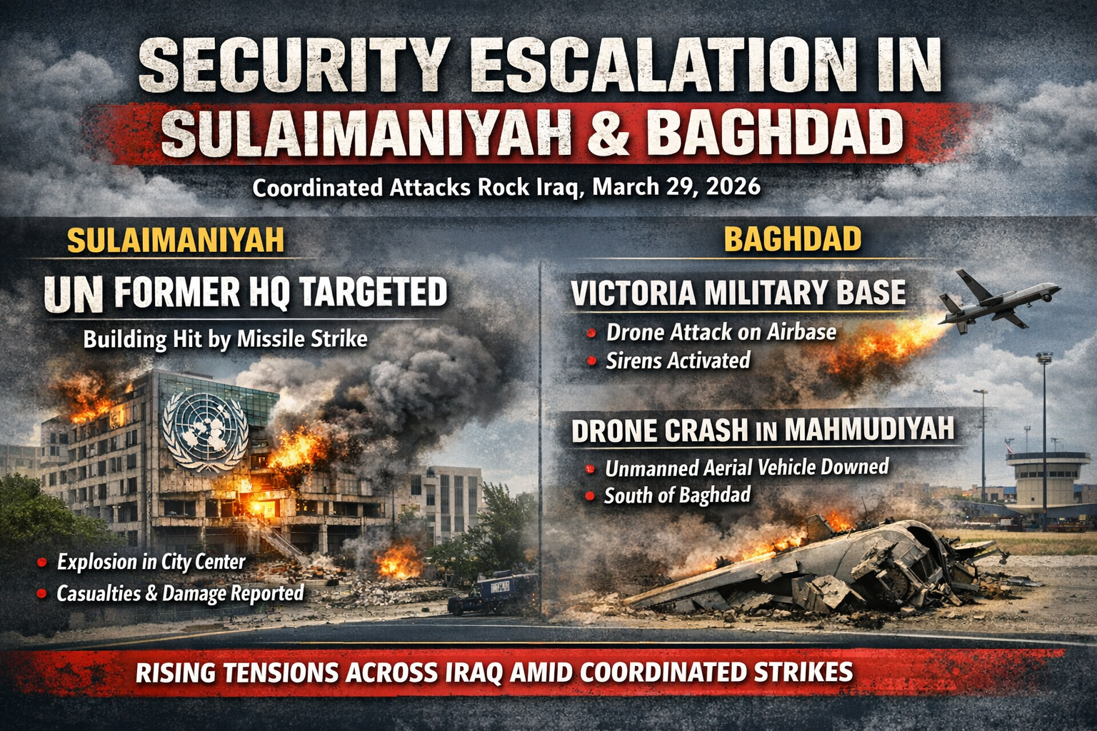 شهد العراق، اليوم الأحد 29 آذار 2026، تصعيداً أمنياً لافتاً تمثل في سلسلة استهدافات متزامنة طالت مواقع حساسة في كل من محافظة السليمانية والعاصمة بغداد، في مؤشر على اتساع رقعة التوتر الأمني خلال الساعات الأخيرة.