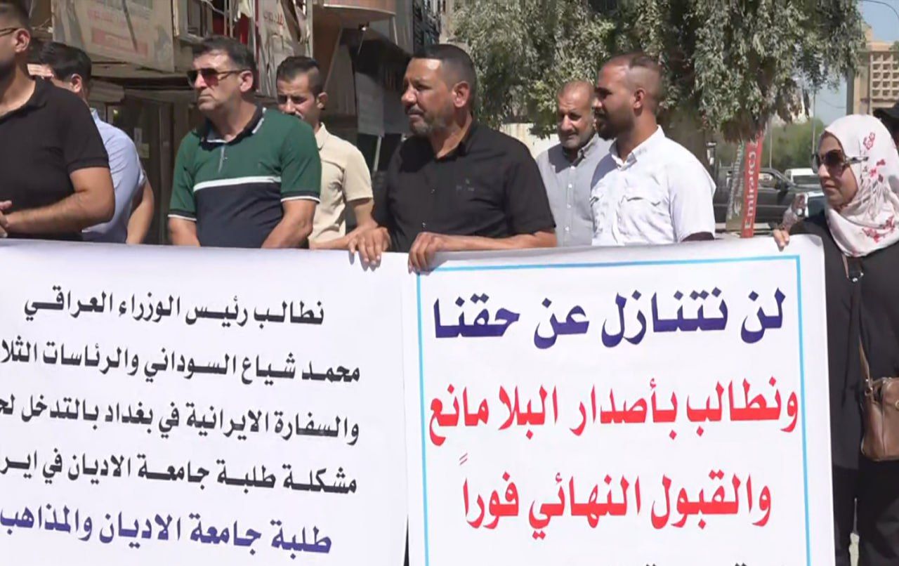 انطلقت صباح اليوم السبت تظاهرة لطلاب عراقيين، امام السفارة الايرانية في منطقة كرادة مريم وسط بغداد ، للمطالبة بحل مشكلة قبولهم “النهائي” بجامعة الاديان الايرانية رغم اتمامهم جميع التزاماتهم المالية والادارية.