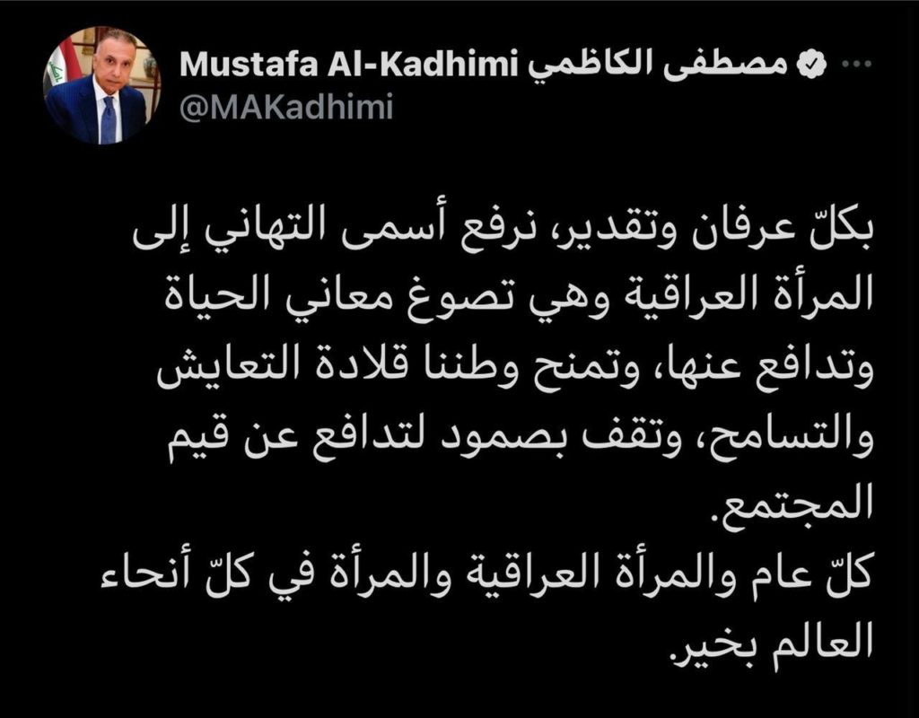 وقال الكاظمي في تغريدة تابعتها – حرية – (8 آذار 2021) ، جاء فيها “بكل عرفان وتقدير، نرفع أسمى التهاني إلى المراة العراقية وهي تصوغ معاني الحياة وتدافع عنها، وتمنح وطننا قلادة التعايش والتسامح”.
