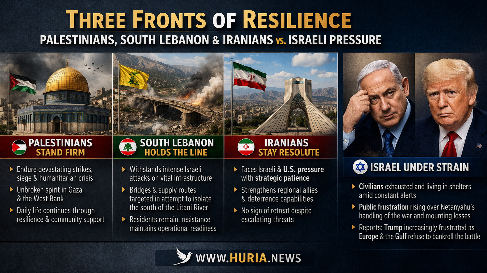 في الأراضي الفلسطينية، يتجلى الصمود في أقسى صوره، حيث يواجه السكان ظروفاً إنسانية معقدة تشمل الحصار، ونقص الإمدادات، والاستهداف المتكرر للبنية التحتية ورغم ذلك، تستمر الحياة اليومية بشكل جزئي، وتظهر قدرة لافتة على التكيف مع الواقع الميداني، سواء من خلال شبكات الدعم المجتمعي أو عبر استمرار بعض الخدمات الأساسية رغم محدوديتها هذا الصمود لا يُقرأ فقط كحالة إنسانية، بل كعامل مؤثر في إطالة أمد المواجهة، وفرض كلفة سياسية وأخلاقية متزايدة على إسرائيل.