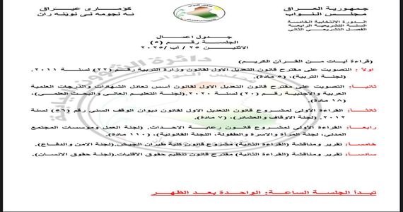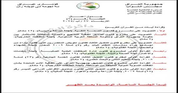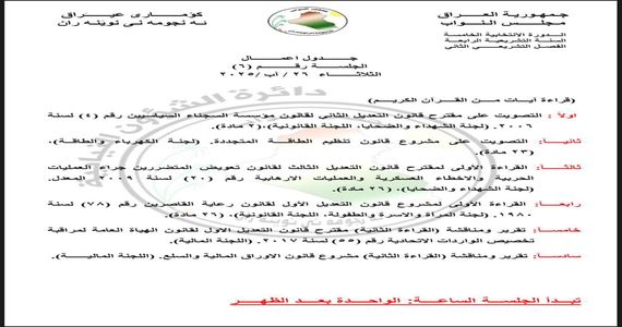 وأضاف أن “جداول أعمال البرلمان لجلسات الأسبوع المقبل الثلاث التي تتضمن التصويت والقراءة الاولى لعدد من مشاريع القوانين .