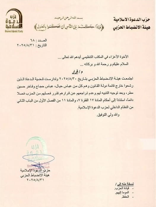 وذكرت وثيقة رسمية :” انه وبعد التنبيه لهم وعدم تراجعهم عن قرارهم تقرر فصلهم من الحزب فصلا دائما استنادا الى احكام المادة 17 الفقرة 7 والمادة 11 من الفصل الاول من الباب الثاني من النظام الداخلي لحزب الدعوة الاسلامية .