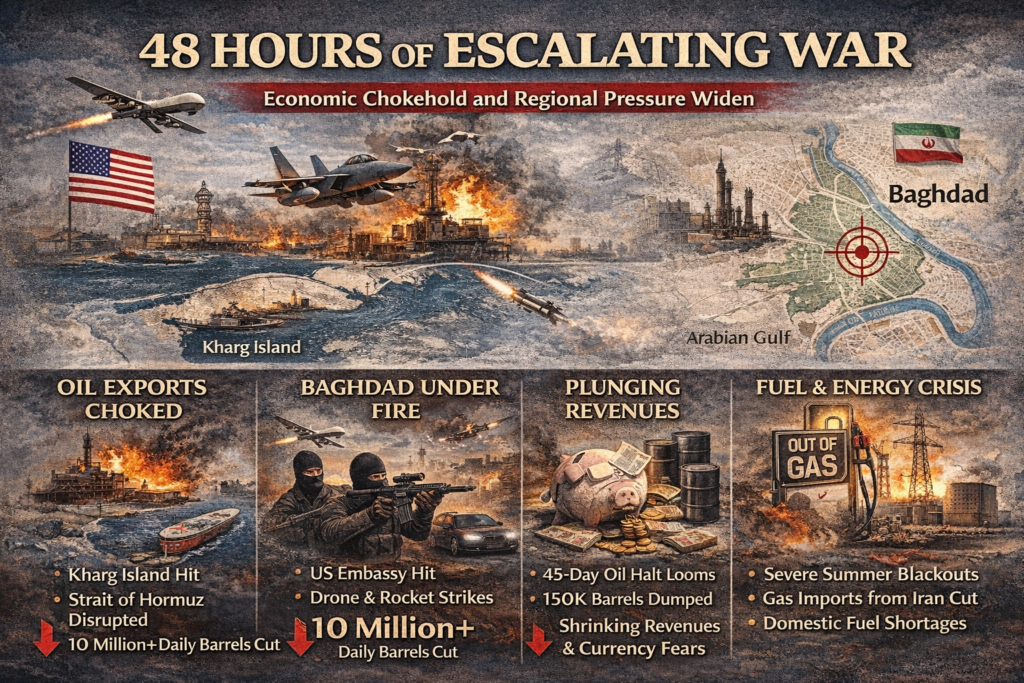 لم تعد الحرب الدائرة بين الولايات المتحدة وإسرائيل من جهة، وإيران ومحورها من جهة أخرى، تُقرأ باعتبارها مجرد تبادل ضربات عسكرية تقليدية. خلال الساعات الـ48 الماضية، أي بين 13 و14 آذار/مارس 2026، انتقلت المواجهة إلى مستوى أشد خطورة: استهداف العقد النفطية الحساسة، خنق الممرات البحرية، تمدد النيران إلى بغداد، واتساع الكلفة الإنسانية والعسكرية والمالية. أخطر ما في هذا التحول أن مركز الثقل لم يعد فقط في السماء الإيرانية أو الجبهة الإسرائيلية، بل صار في جزيرة خرج، ومضيق هرمز، والسفارة الأمريكية في بغداد، وحقول الإنتاج ومسارات الشحن وأسواق الطاقة العالمية.